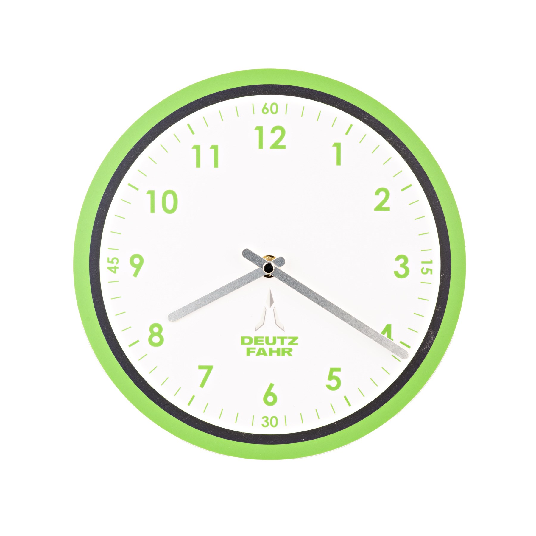 Ronde wandklok DEUTZ-FAHR met zwarte wijzers. Gepersonaliseerd met de typische kleuren van het merk. Wordt geleverd zonder batterij.